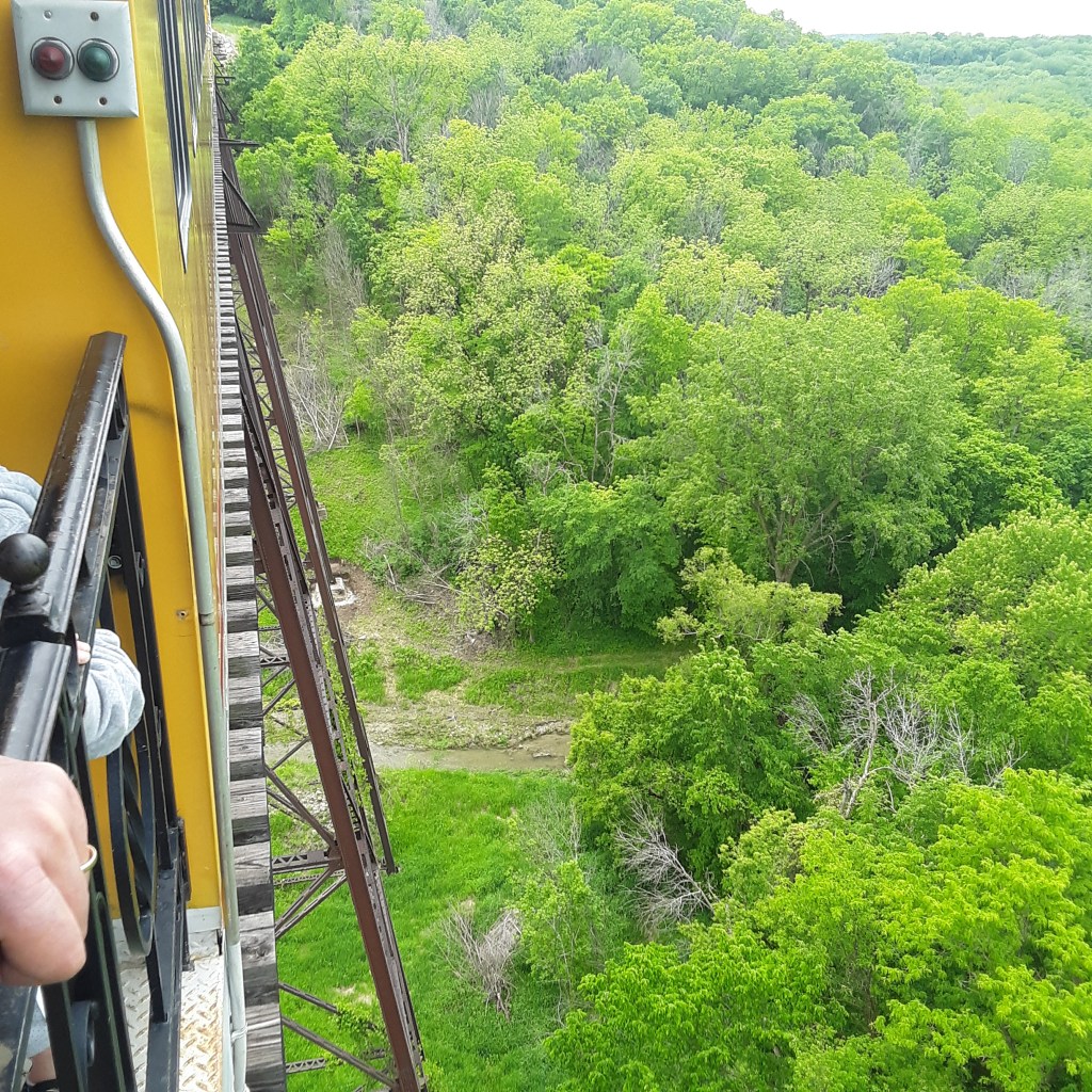 My husband and I traveled to Boone, Iowa, to ride an old train this week. The Boone and Scenic Valley Railroad operates over an 11-mile section of the former Fort Dodge, Des Moines & Southern Railroad, between Boone and Wolf, Iowa, a former junction with the Minneapolis & St. Louis Railway. Visitors can see several restored trains from the 1930s – 40s and enjoy a ride on the rails through the scenic Des Moines River Valley. While sitting at our candle-lit table, complete with roses in a vase, we were serenaded by vintage music and lush landscape views. At one point, our train crossed Bass Point Creek on a 156-foot-tall steel bridge that took us high above the treetops. It was brief, breathtaking, and so worth the trouble of the long drive there.